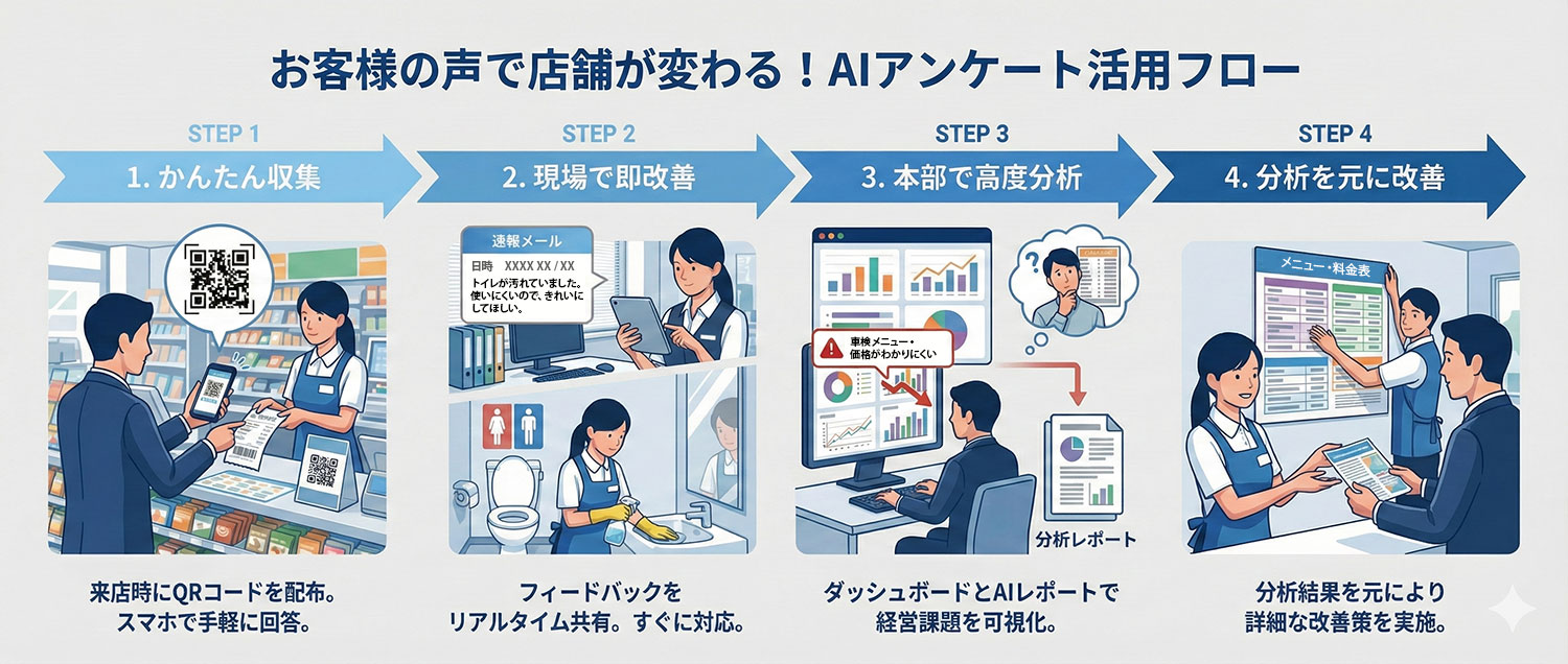 お客様の回答は即座にデータベースへ蓄積されます。現場には改善フィードバックが、本部にはダッシュボードが提供され、当社AIがレポートを作成。声の活用までを自動化します。※図はガソリンスタンド業界の例ですが、飲食店や小売店など、様々な店舗業界でご活用いただけます。